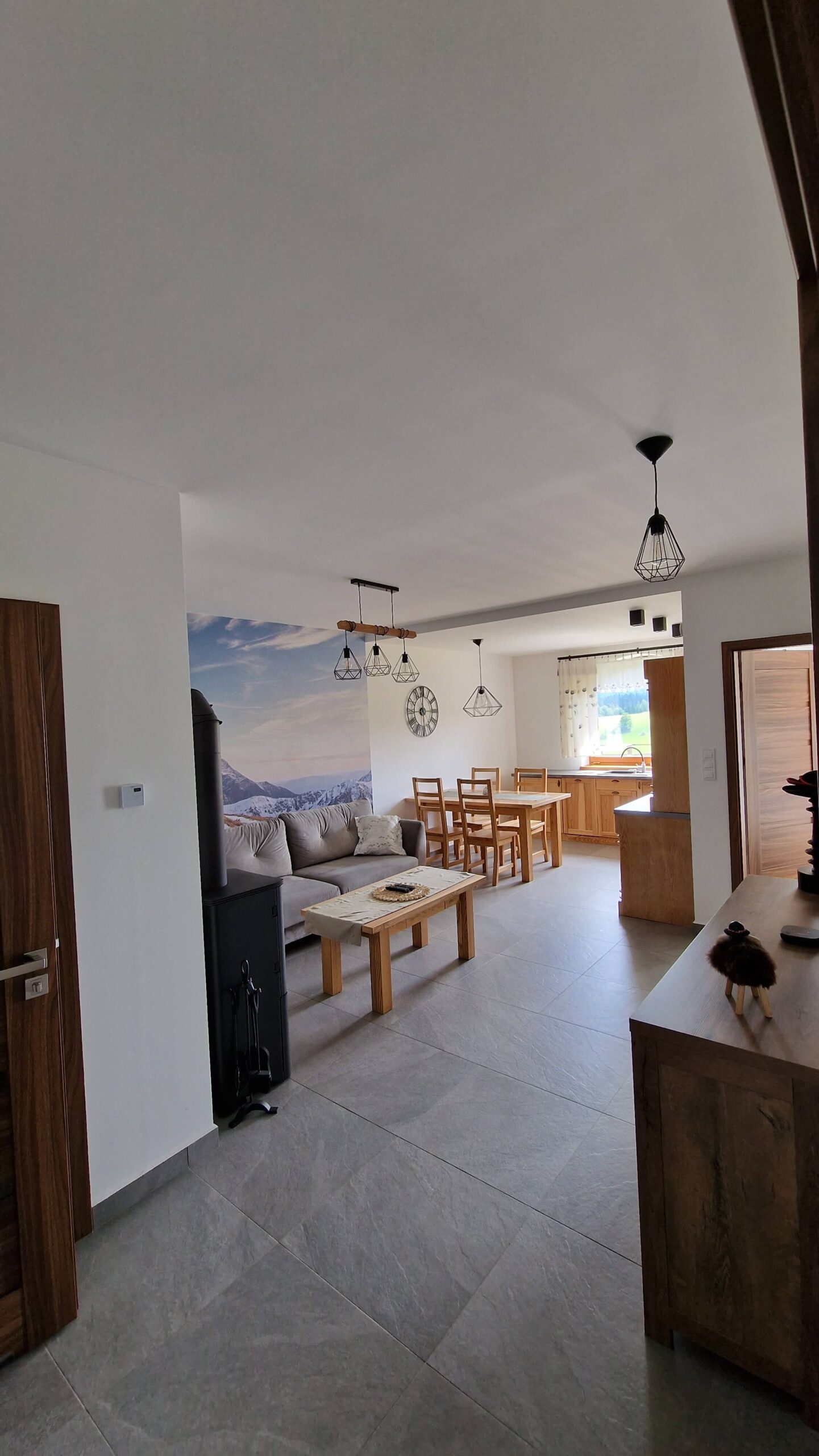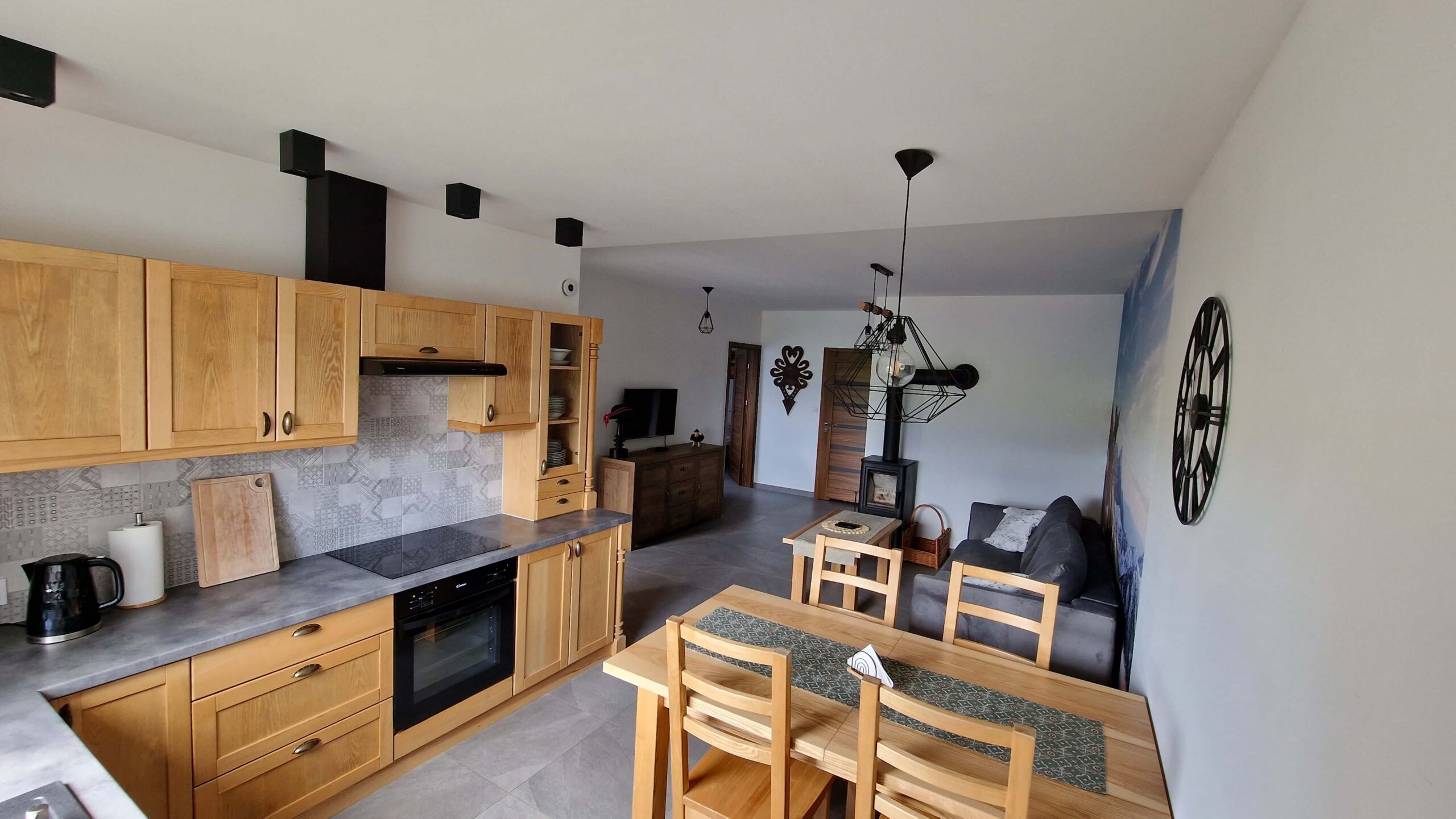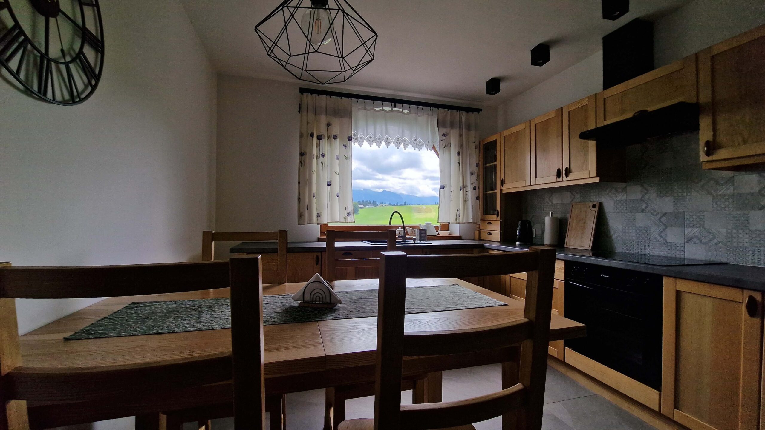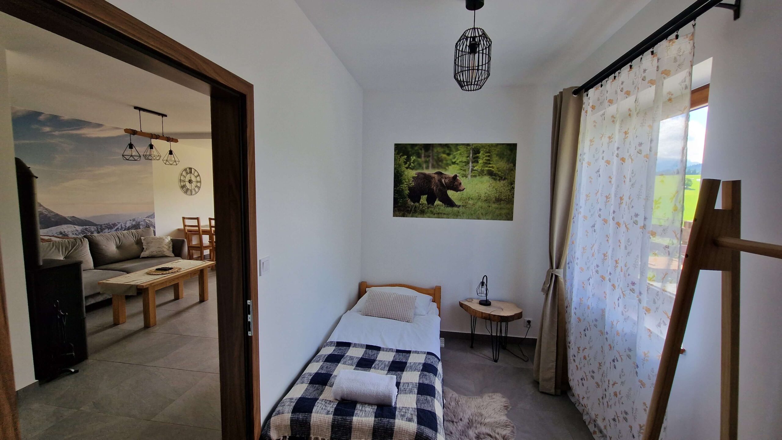 Apartament nr 2 nawet dla siedmiu osób. W środku znajdziesz dwie sypialnie (2 i 3-osobowe), wyposażoną kuchnię i klimatyczny salon z kominkiem i TV. Duże okna z pięknym widokiem na góry umilają pobyt i sprawiają, że apartament jest bardzo dobrze doświetlony.