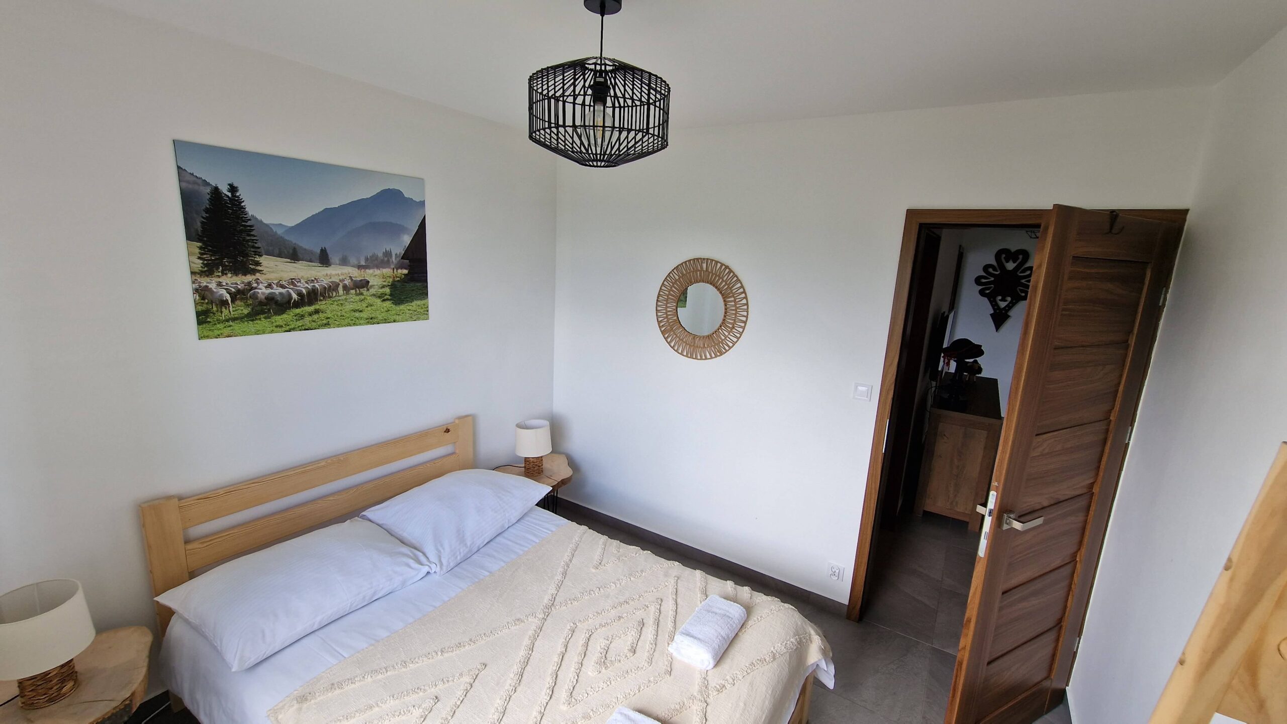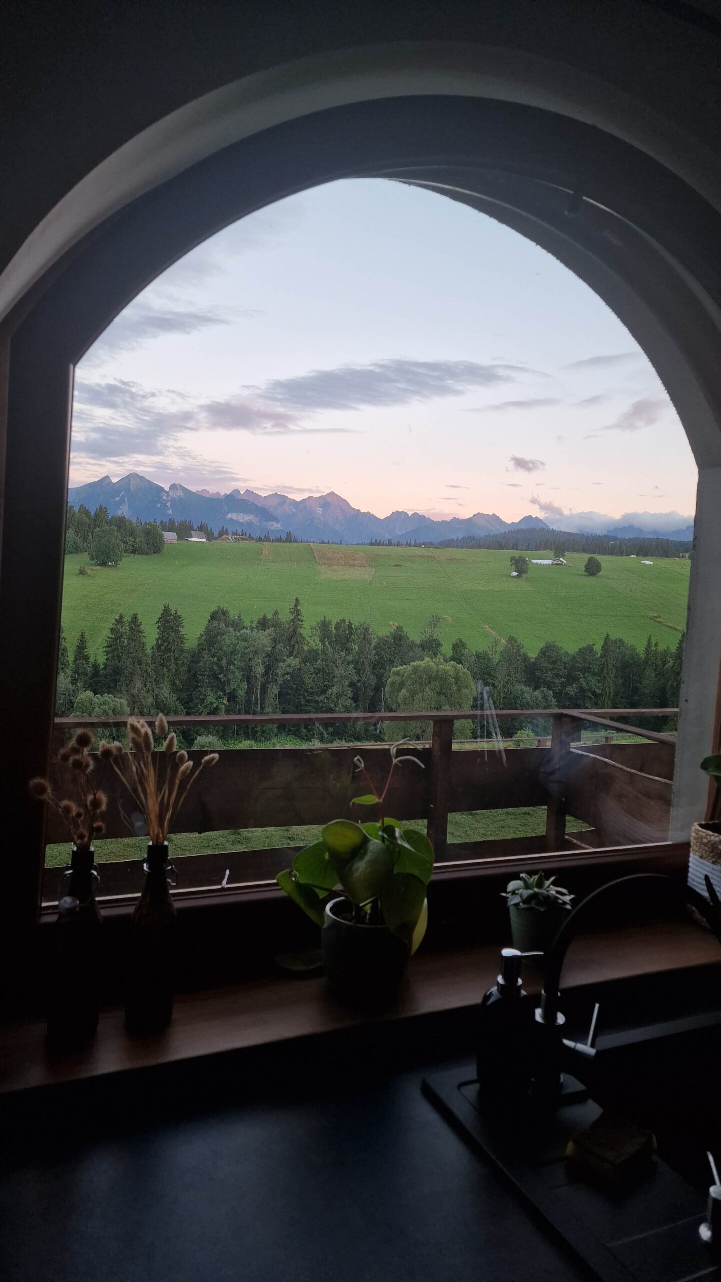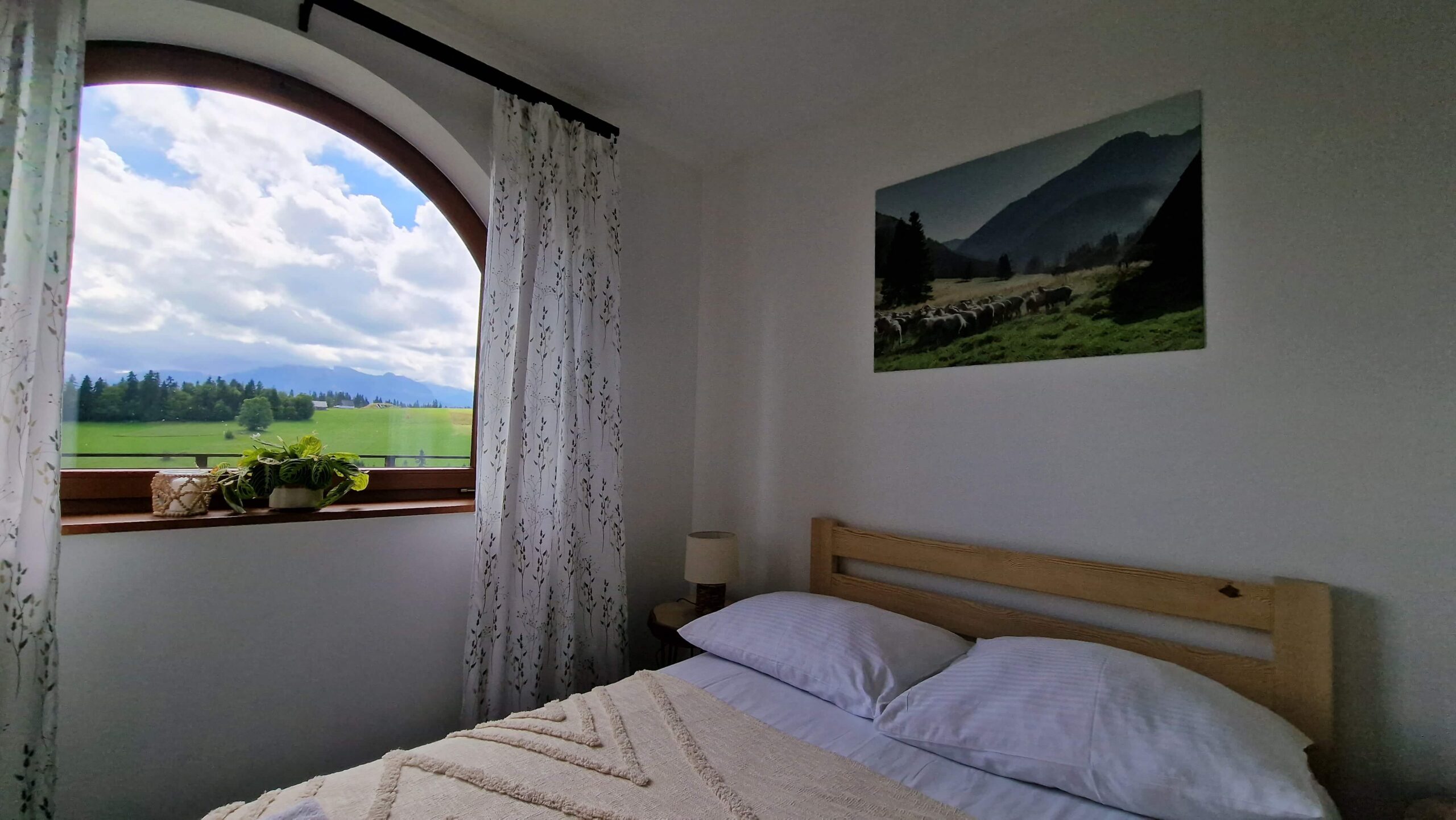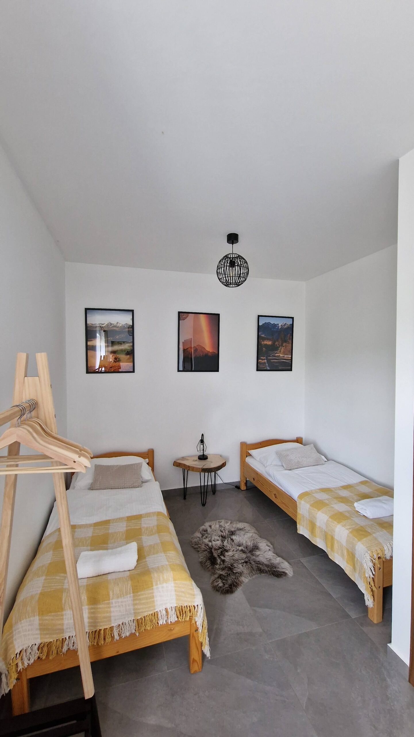 Apartament nr 2 nawet dla siedmiu osób. W środku znajdziesz dwie sypialnie (2 i 3-osobowe), wyposażoną kuchnię i klimatyczny salon z kominkiem i TV. Duże okna z pięknym widokiem na góry umilają pobyt i sprawiają, że apartament jest bardzo dobrze doświetlony.