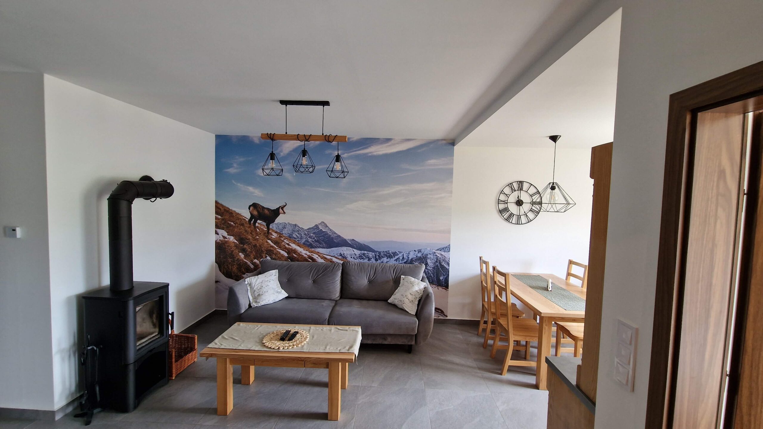 Salon: rozkładana 2-osobowa sofa, Smart TV z telewizją radiową, koza (kominek), komoda, w której znajdziesz zabawki dla dzieci, stół jadalniany z czterema krzesłami